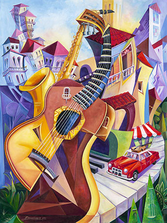 In 1968 he attended a school for Fine Arts called San Alejandro in Havana. In that same year, he switched schools to attend Taller Escuela de las FAR (Workshop school of the FAR). In his first years of studies he felt attracted to the work of Cezanne, Braque, Picasso and cubism in general, that’s why as an Artist his first creations were very much like those he liked mixed with realism. When walking the streets of old Havana, seeing its buildings, its columns, its grey colors, ochres, sienna, the cheerful colors of his native countryside, the green of the trees, the red of the land, the beauty of the birds and the look of the painter, in that wide world, he developed his style.