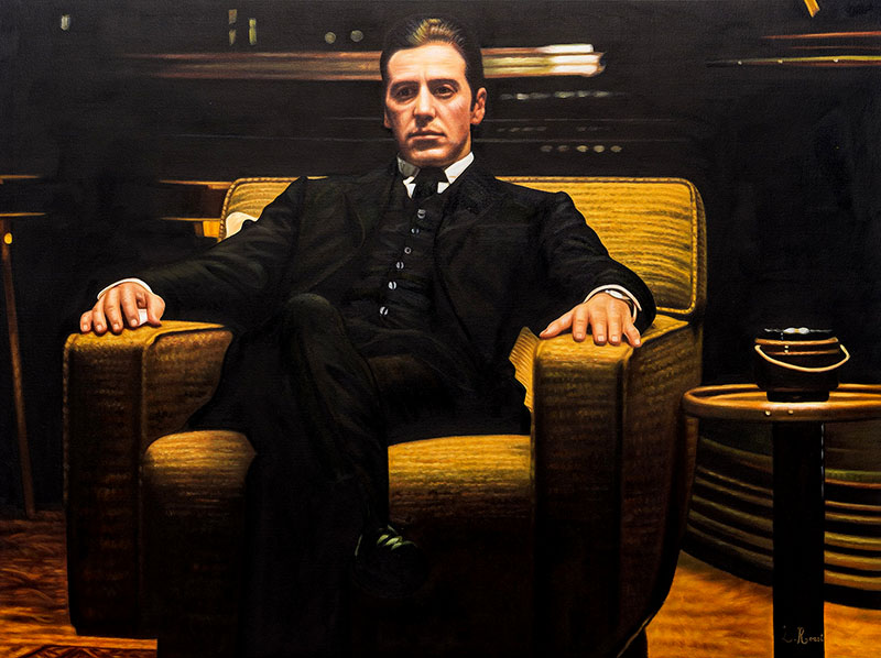 In their exploration of pop culture icons, Rossi demonstrates a profound connection to classic cinema, seen in powerful portraits like "Marilyn Monroe," "The Godfather," and "Don Vito Corleone," where the subjects' personas are portrayed with remarkable authenticity and psychological depth.
