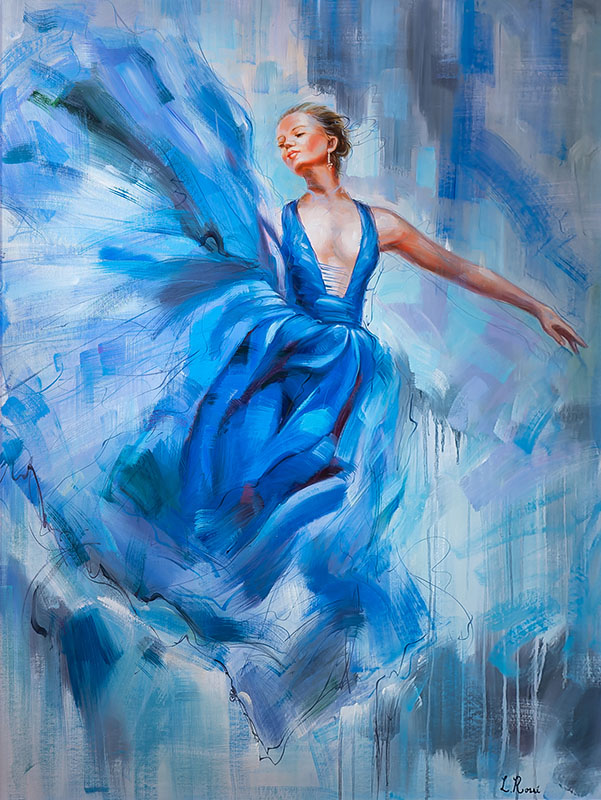 Through skillful brushwork and nuanced color palettes, Rossi brings to life portraits that range from cinematic legends to graceful, elegant figures immersed in dynamic motion. The artist’s ability to depict movement and emotion is particularly evident in pieces such as "Blue Sky Dance," where fluid strokes convey both grace and power.