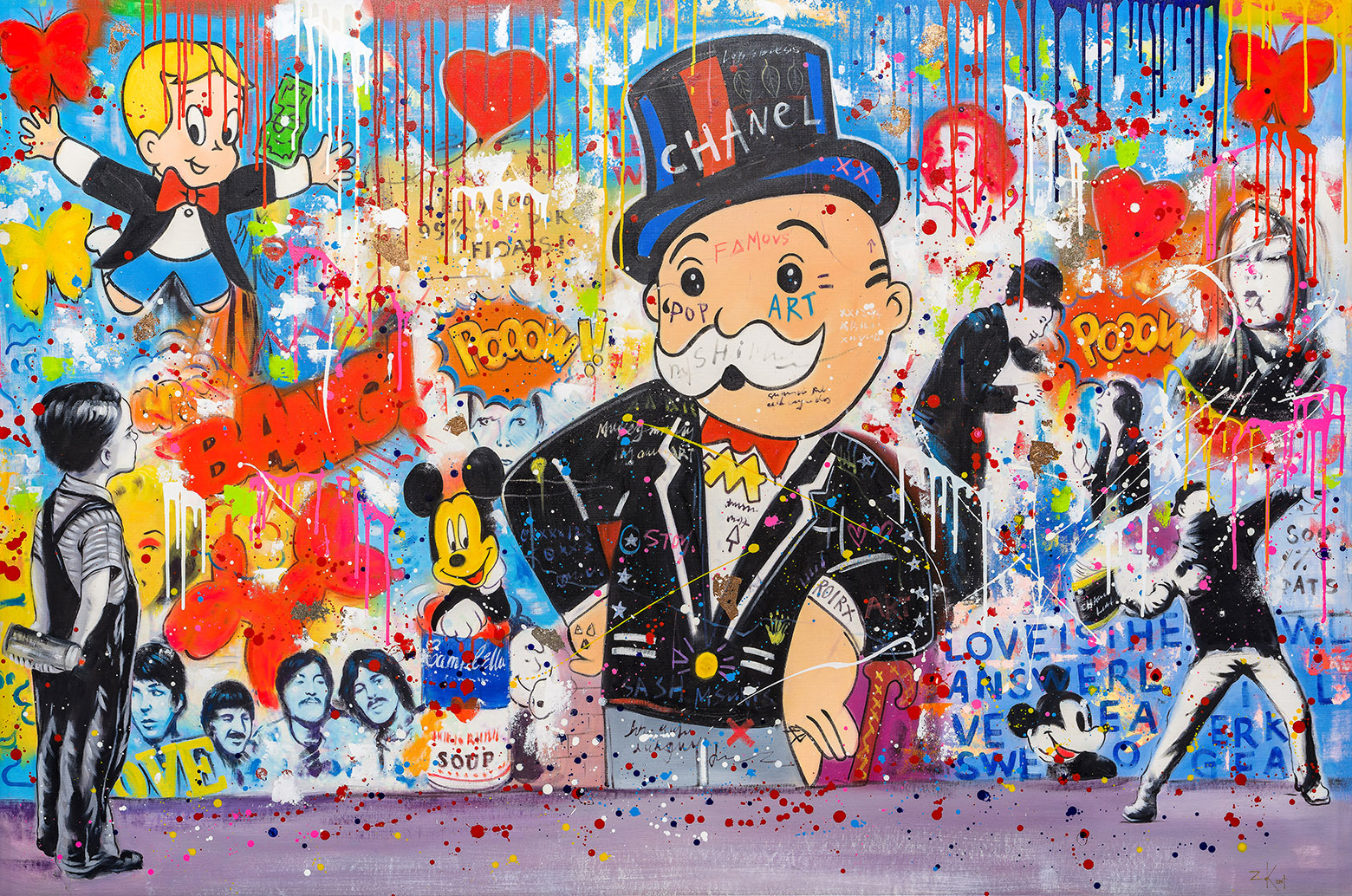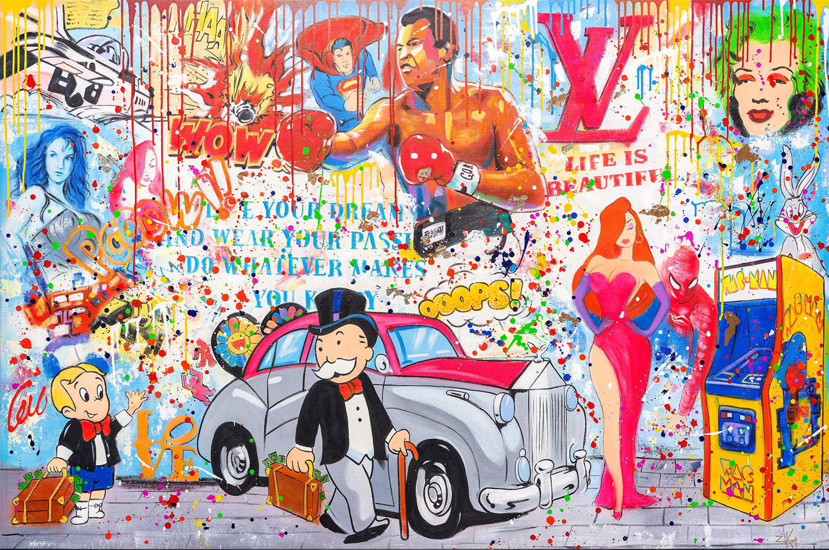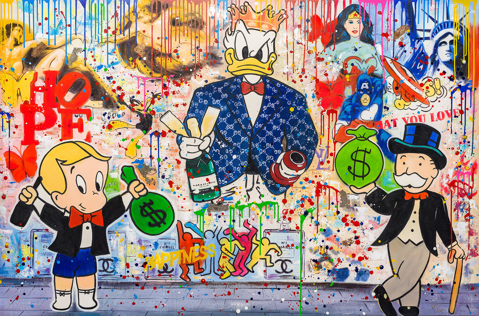 Zac Kent is a contemporary mixed-media artist whose bold, vibrant works bridge the worlds of pop culture, street art, and luxury iconography. Drawing on a collage-like approach, Kent fuses familiar cartoon characters, designer logos, and graffiti-inspired elements to spark playful yet provocative reflections on consumerism, nostalgia, and the symbols of status. In each piece, drips of paint, layered stencils, and dynamic color splashes animate his canvases with an almost electric energy, recalling the spontaneity of urban street art.
